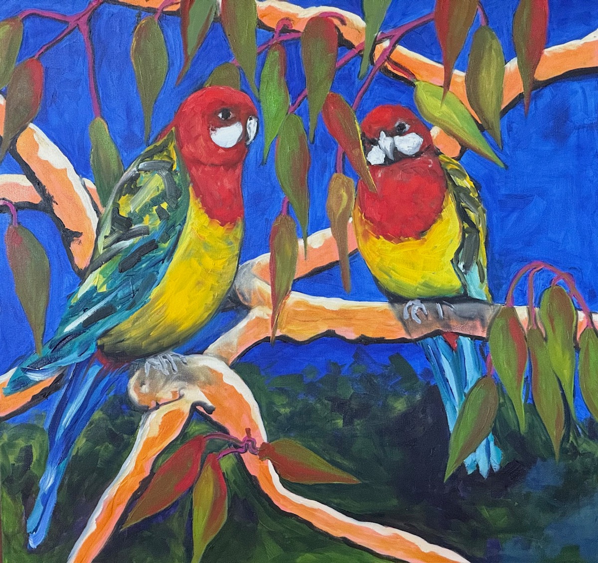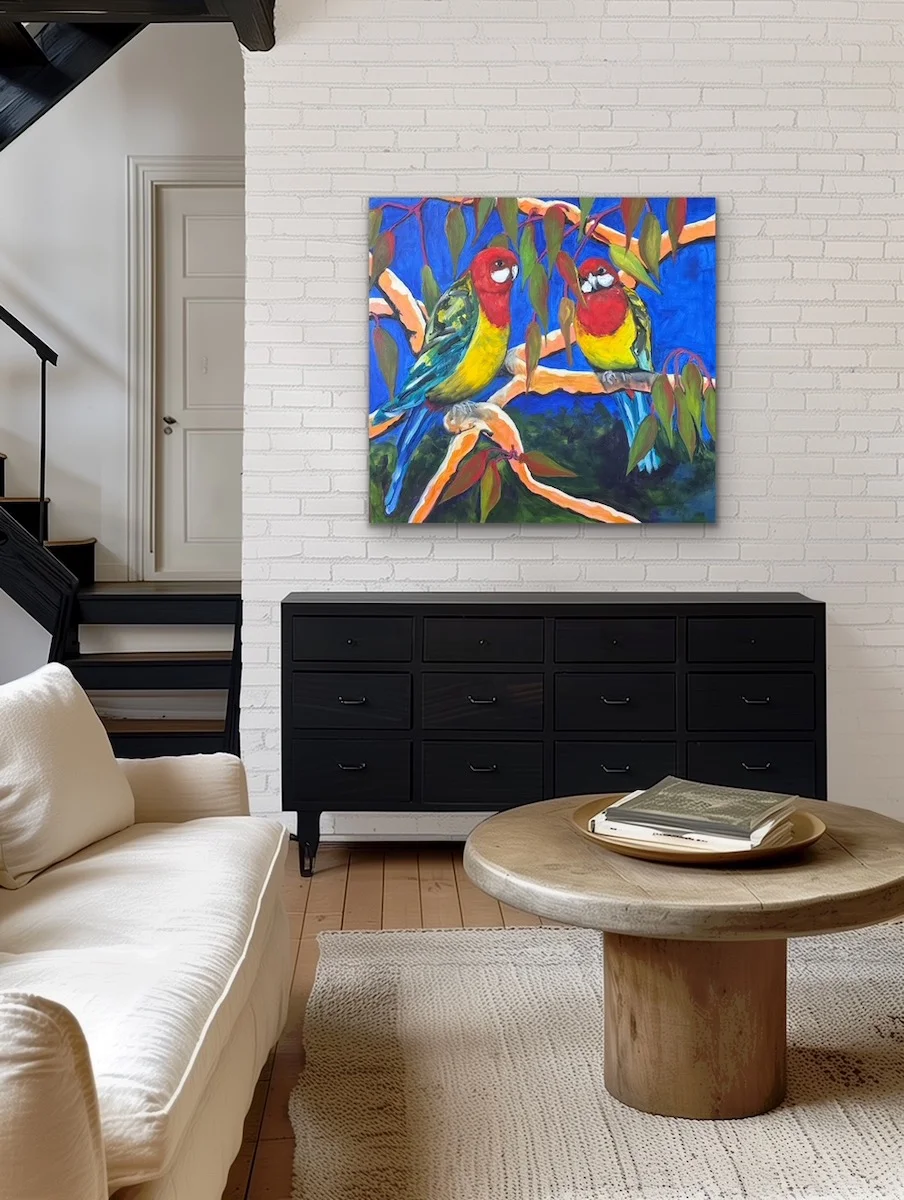A bright contemporary painting to brighten your day. These Eastern Rosellas are sitting in a gum tree on a hot summers day. I like to think that they are a happy couple sharing their news with each other. The painting is an original artwork, signed on the front, varnished for protection and ready to hang with secure hardware.