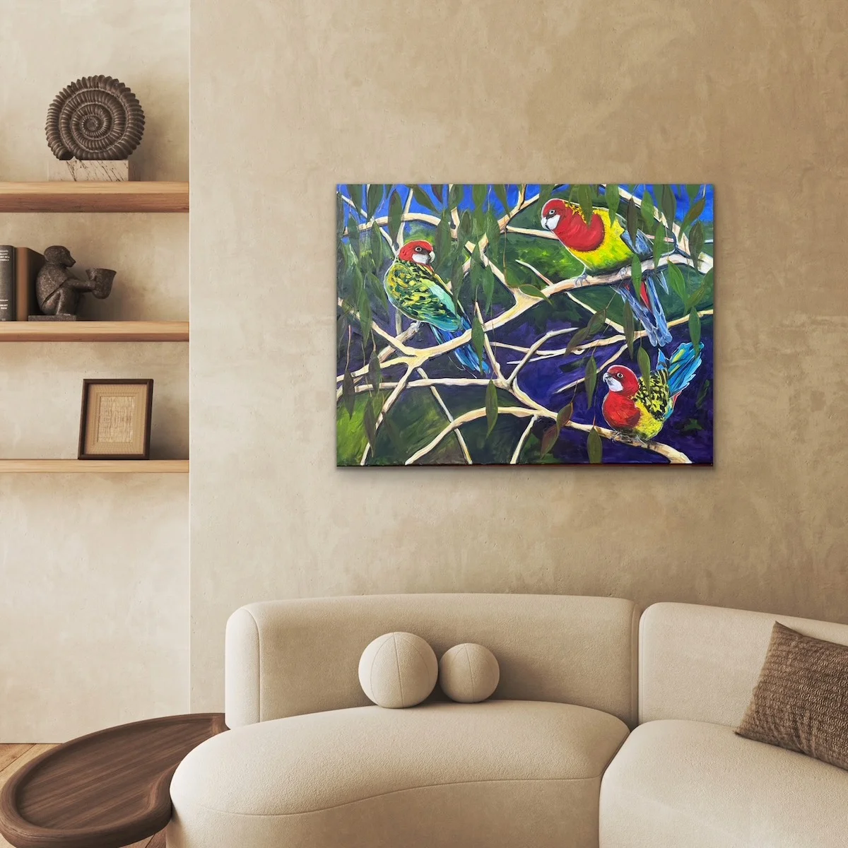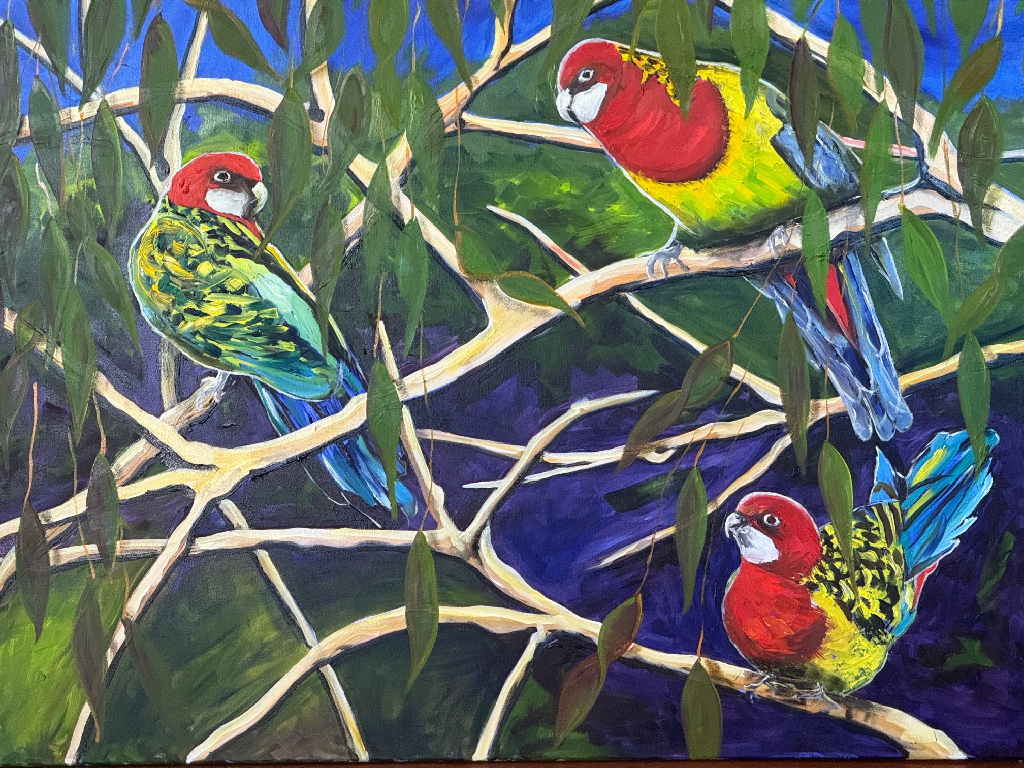 A large bright contemporary painting to brighten your day. These Eastern Rosellas are resting in a gum tree. The bright blue sky is truly Australian. The painting is an original artwork, signed on the front, varnished for protection and ready to hang with secure hardware.