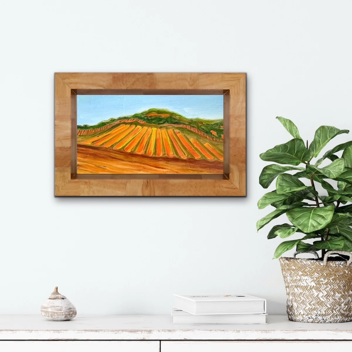 A petite contemporary painting capturing the rhythmic rows of grape vines in their autumn colours. The painting is an original artwork, signed on the front, varnished for protection and ready to hang with secure hardware.