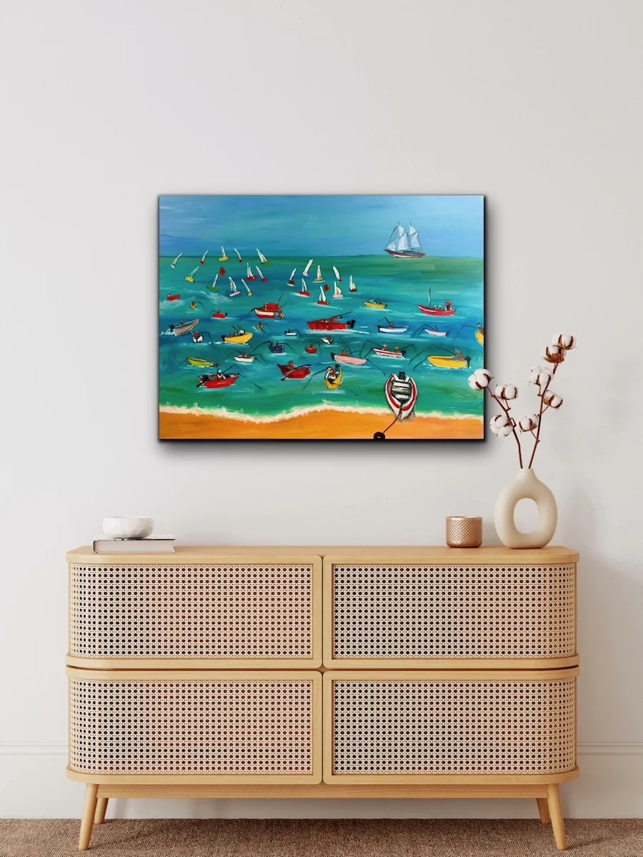 A bright happy seascape. Would suit a holiday home. The painting is an original artwork, signed on the front, varnished for protection and ready to hang with secure hardware.