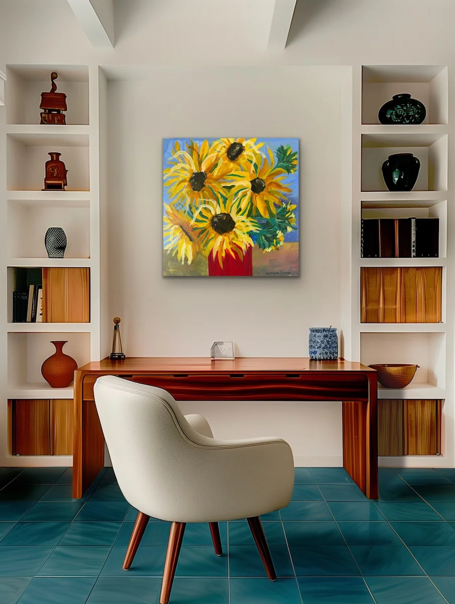 Who can resist a bowl of sunflowers in a bright red vase? The painting is an original artwork, signed on the front, varnished for protection and ready to hang with secure hardware.